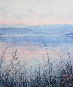 Anyways. Back to the illustrious history of this piece depicting a view of Burrard Inlet from Rocky Point Park. Boathouse diners a year or so ago may have been amused to see a perspiring me running to catch this sunset on camera before it was too late. I continued the theme of indignity by hunkering down on the muddy ground to make sure I got some foreground grasses in the shot.