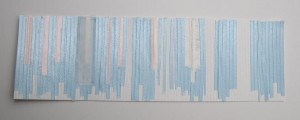 This is white paper with lengths of pink, cream and blue ribbon or unpainted silk glued on (and some areas deliberately left white) meant to depict reflections on the water. I sometimes frayed one or both sides of the ribbon or silk pieces to help make the colours look more graduated.