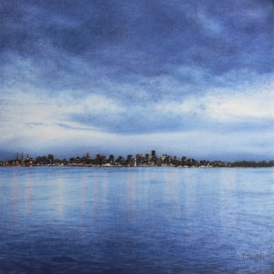 My latest piece, depicting the skyline of Vancouver, Canada. This one’s a whopping 8 x 8 inches : ) I was able to go larger as it involved hand sewing only. Machine sewing limits the size of the hoop you can use, because it has to be a small enough diameter for the edge of the hoop not to bang against the arm of the machine while you sew. (I found this out the hard way).